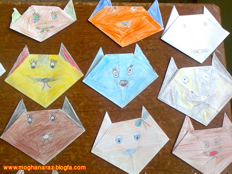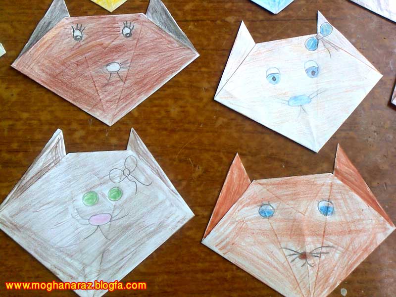 اریگامی گربه: (چنانچه عکسی باز نشد روی آن کلیک راست کرده سپس بر روی گزینه ی Reload Image یا Show Picture کلیک کنید) ابتدا این کاغذ و تا را با استفاده از کاغذهای باطله به دانش آموزان، آموزش داده سپس انتظار می رود آنها خودشان با استفاده از کاغذ سفید A4 این شکل را درست کرده و رنگ آمیزی کنند.